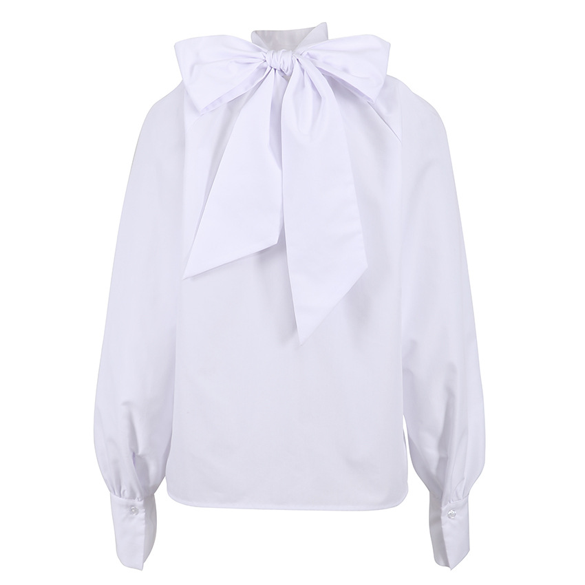 スカートでもパンツでも合わせやすく、首元の大きなリボンタイがアクセントになる上品なデザインです。