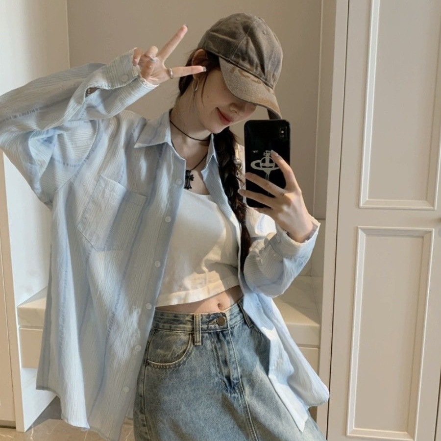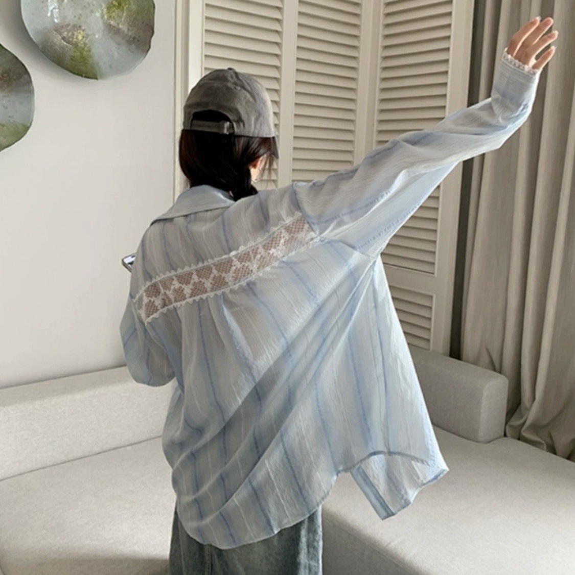 デニム風の素材感で日焼け対策にも最適なトップスです。