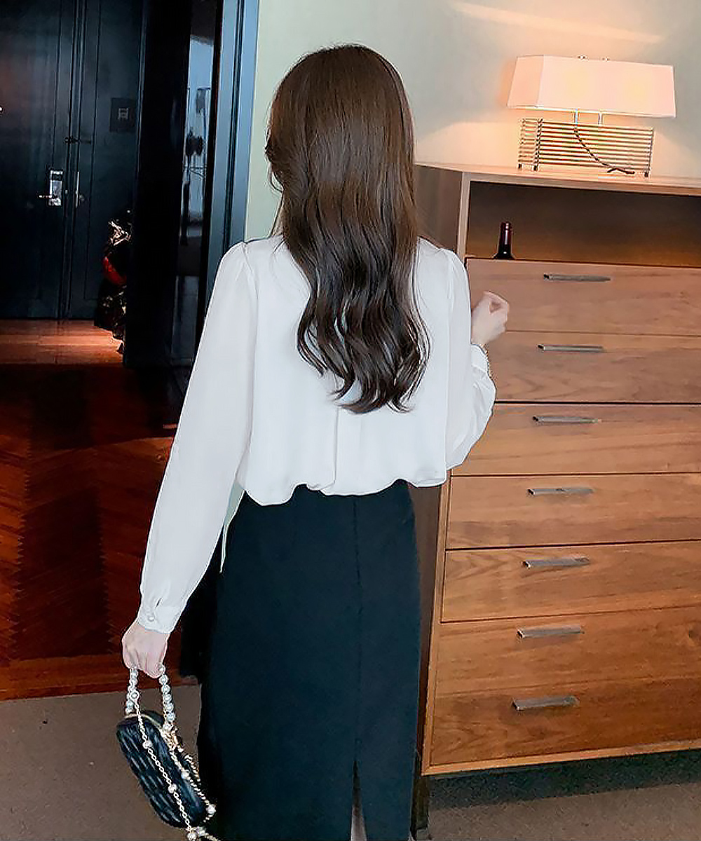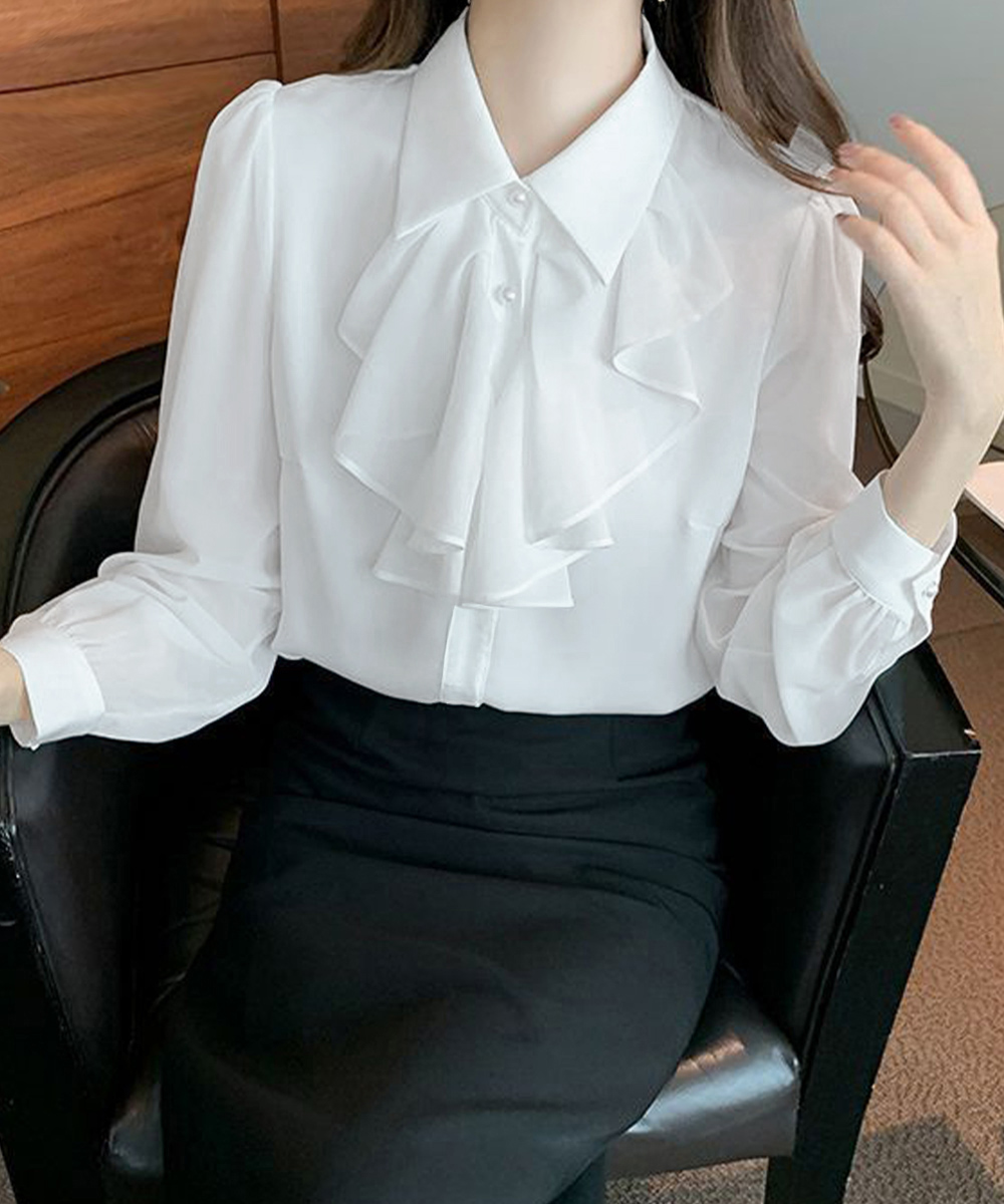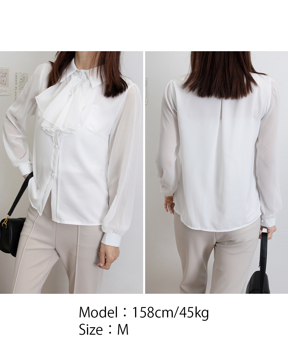胸元の上品なフリルリボンが印象的な、レディースシャツです。