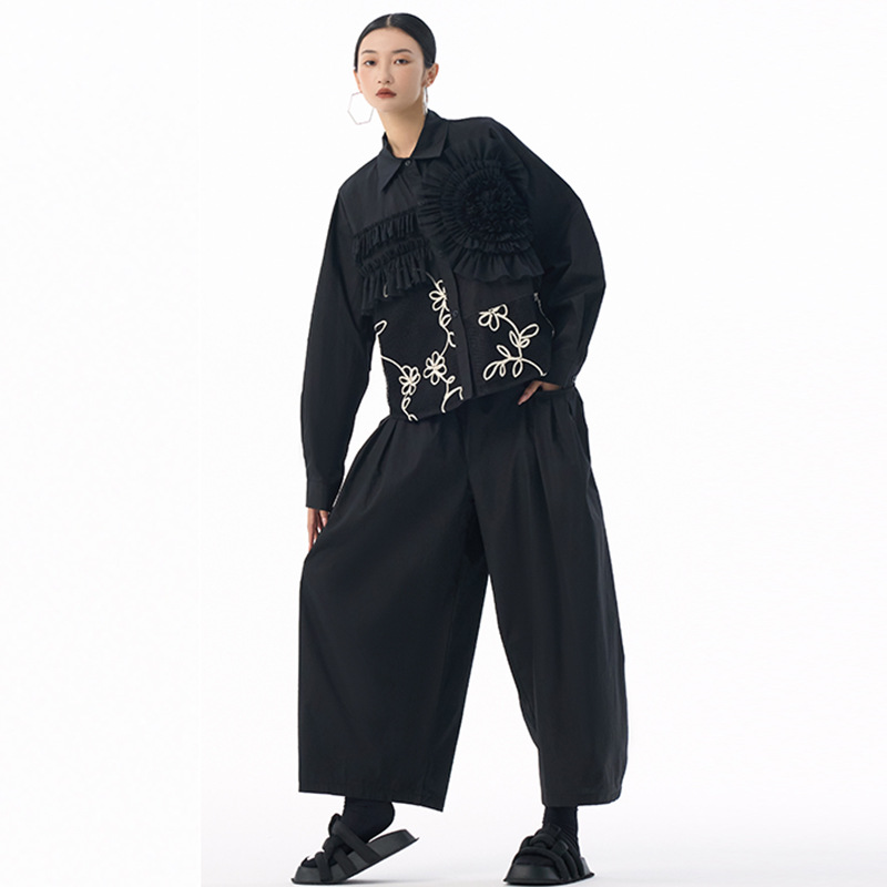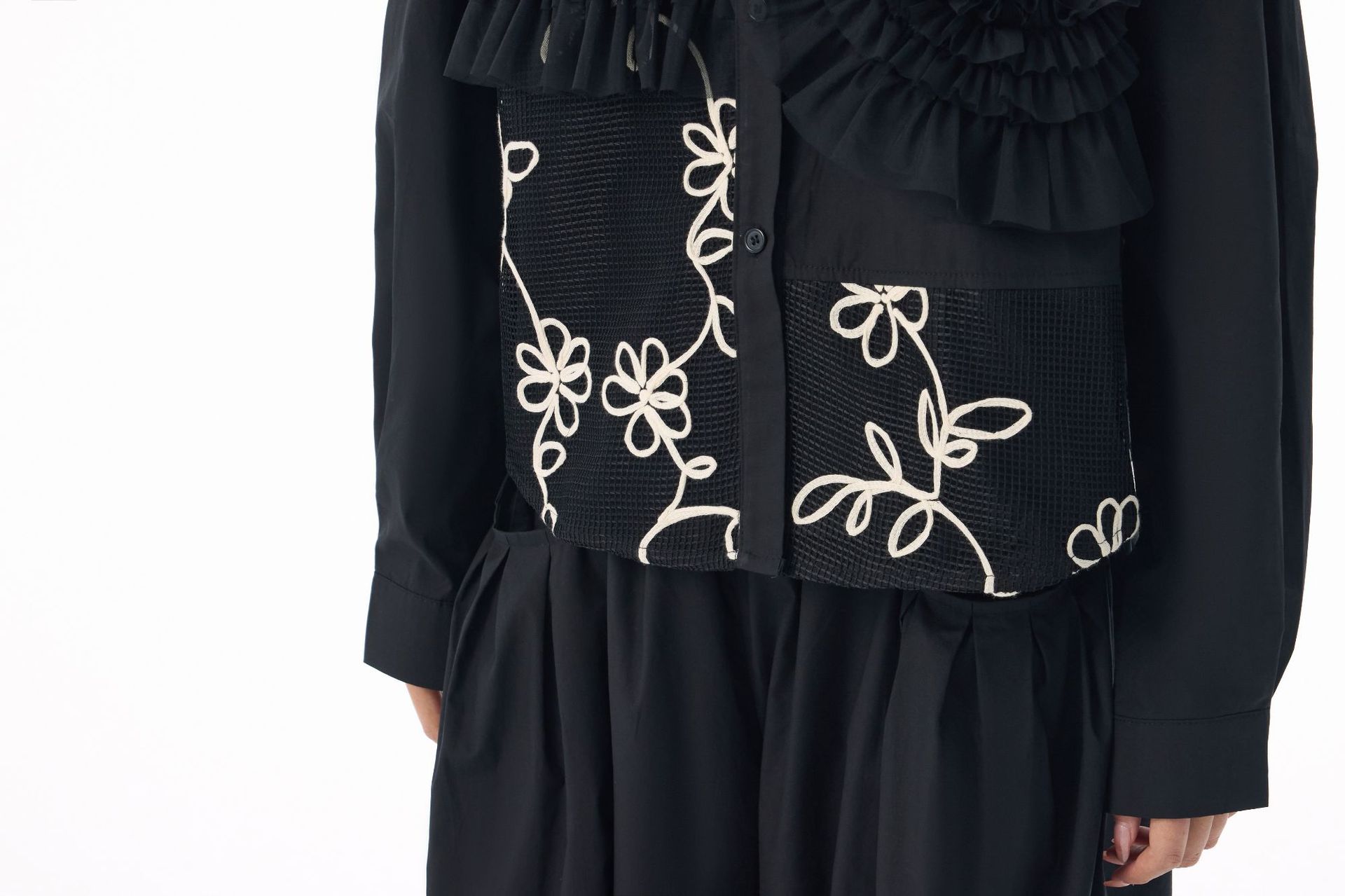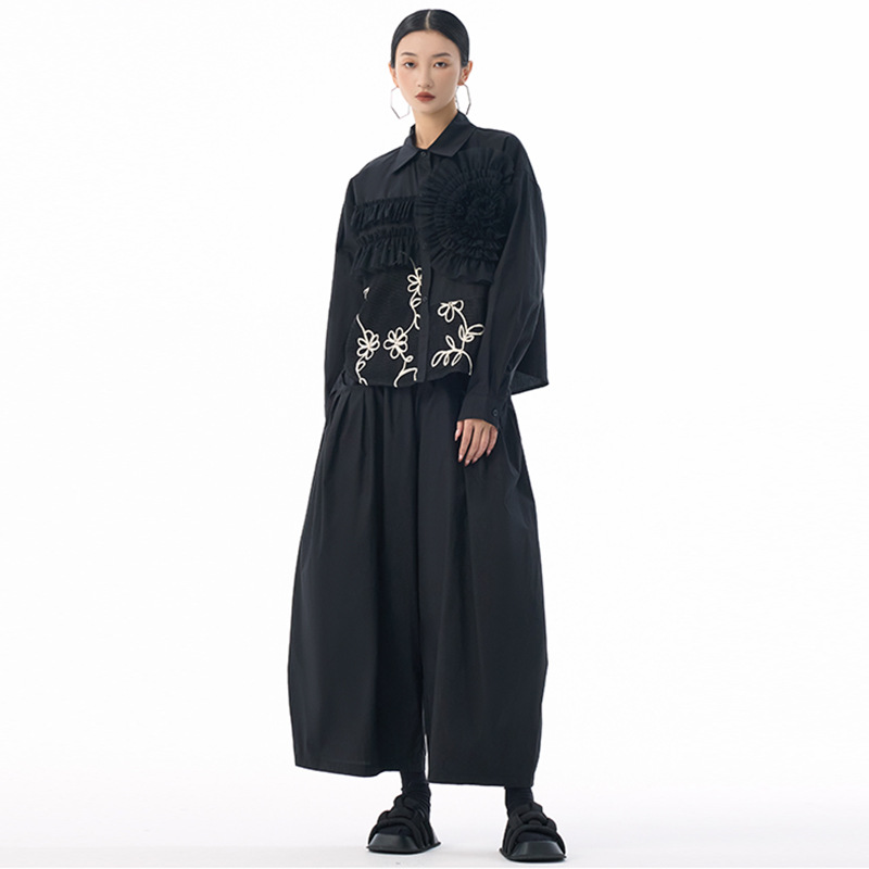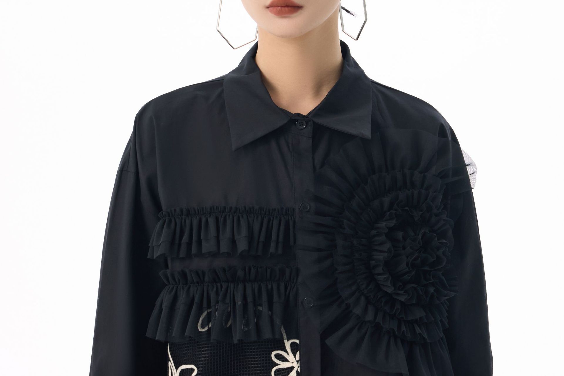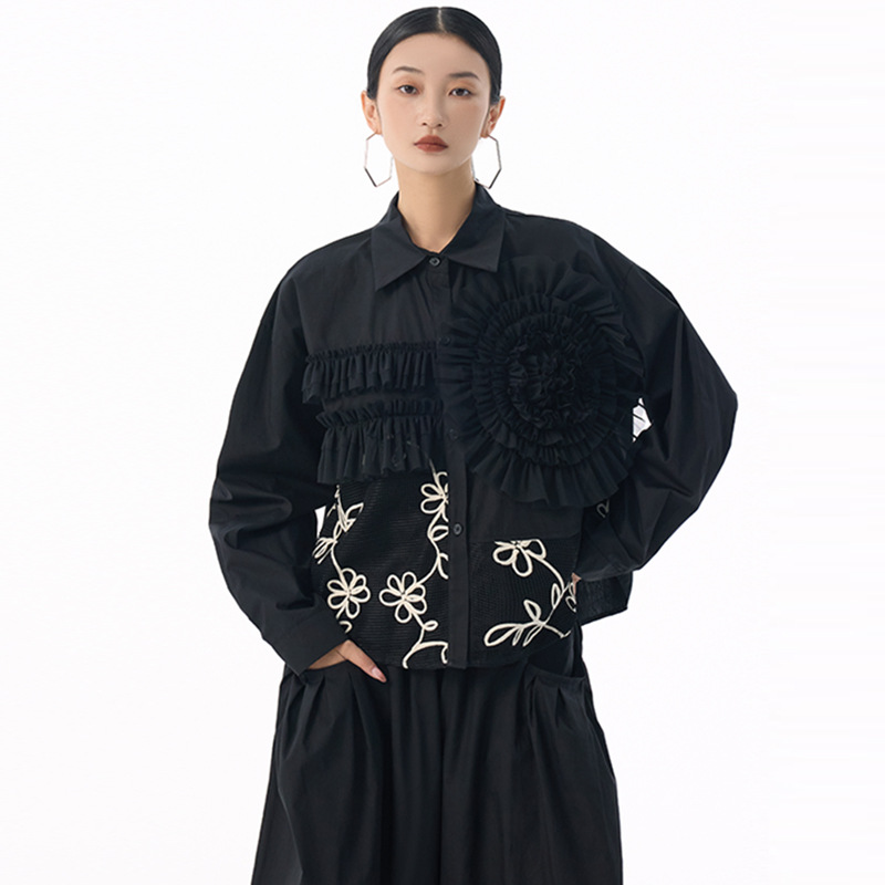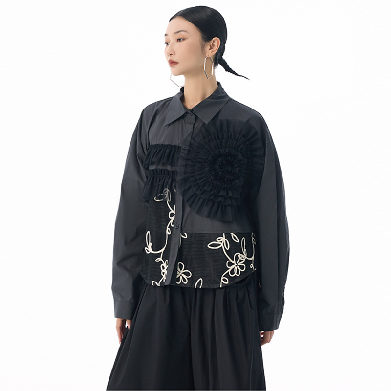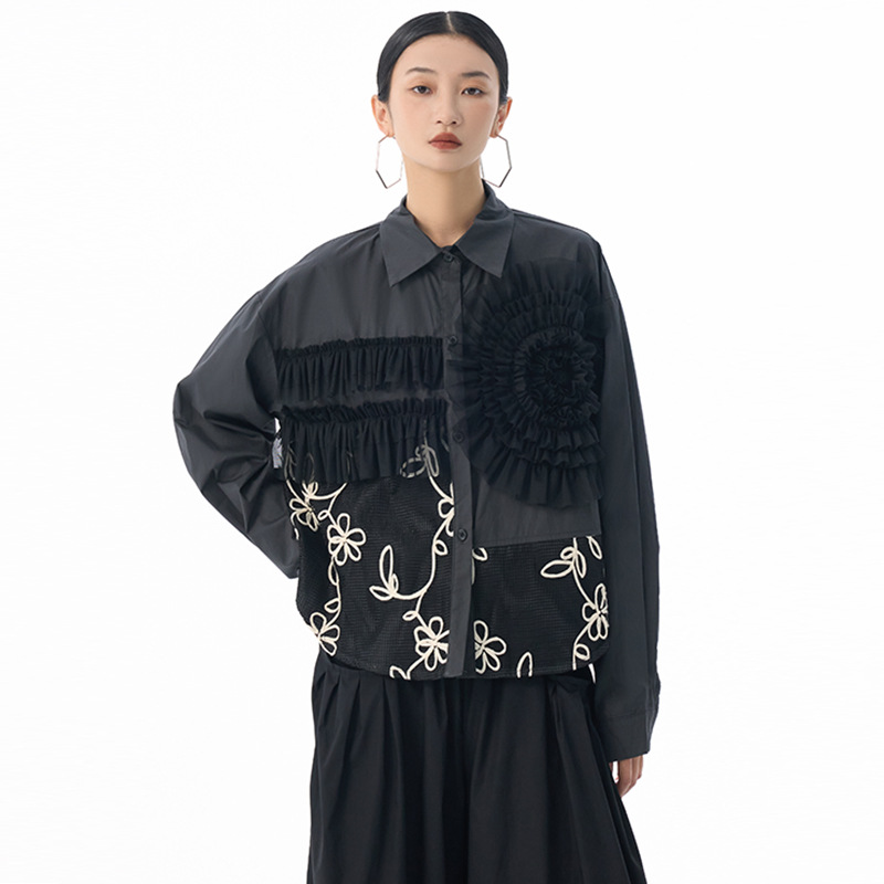 素材:ポリエステル 個性的なチュール素材と皺加工を組み合わせた切替デザインが魅力的なレディースシャツです。 花柄刺繍とギャザー加工が上品で華やかな印象を演出し、特別な日のコーディネートにも最適です。