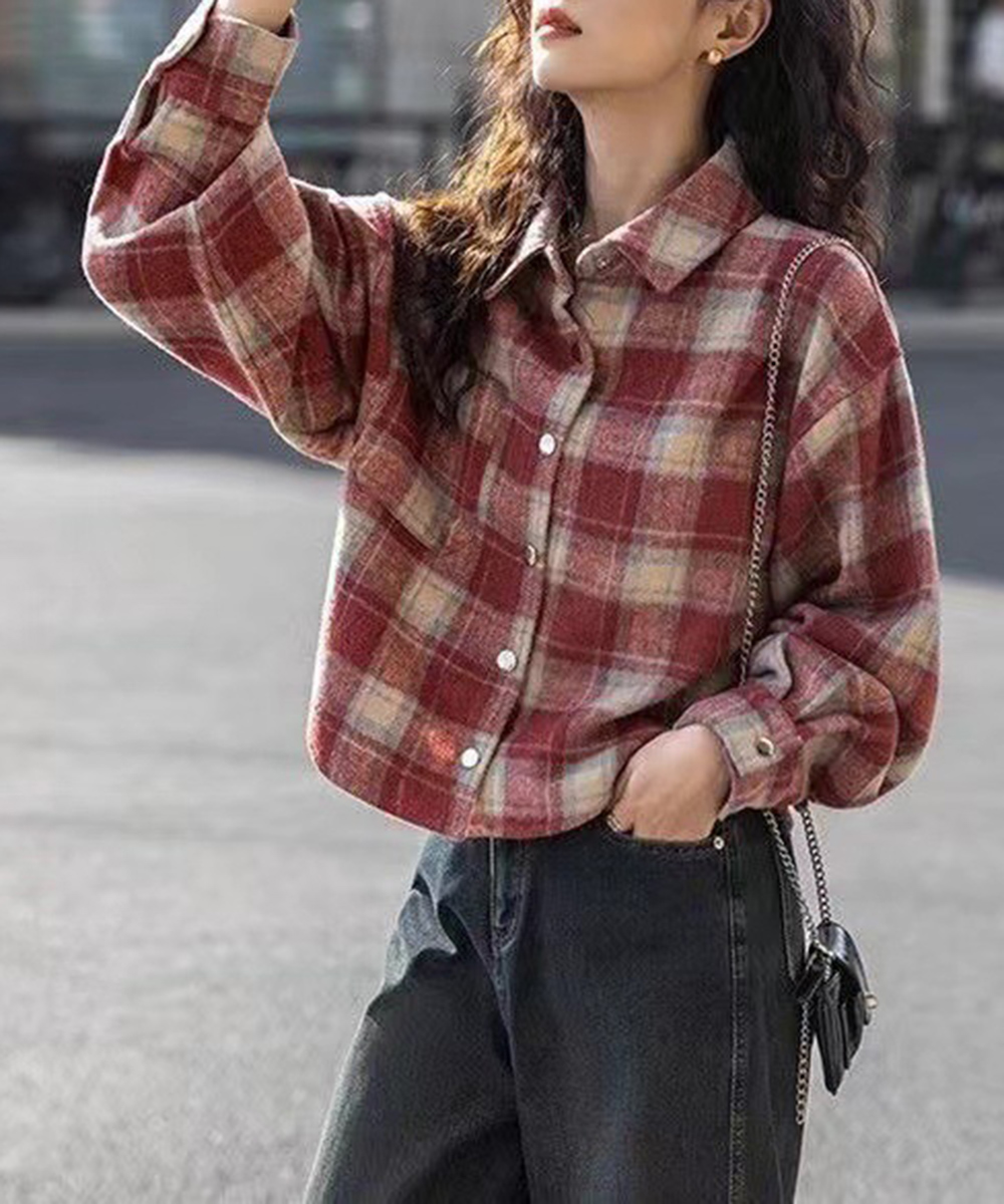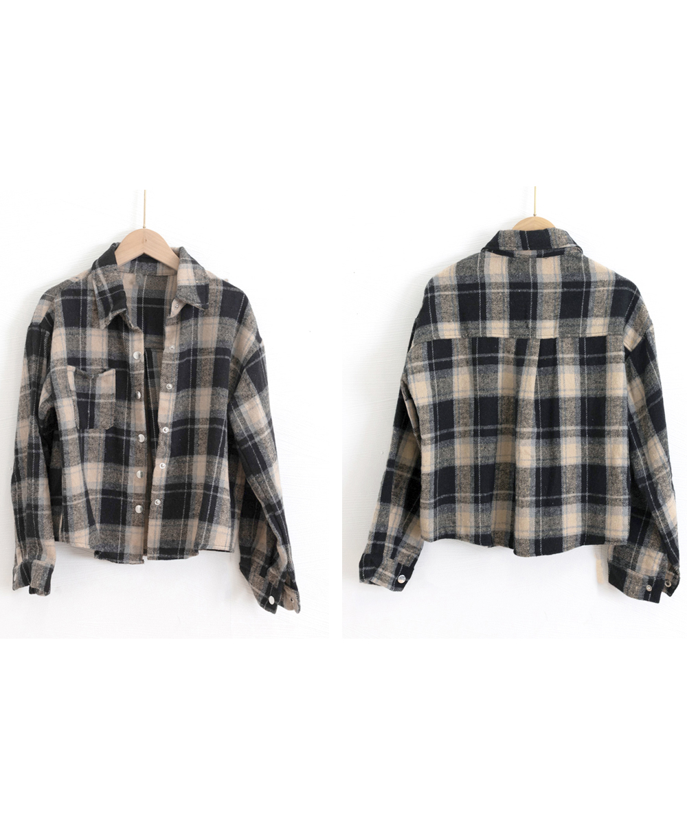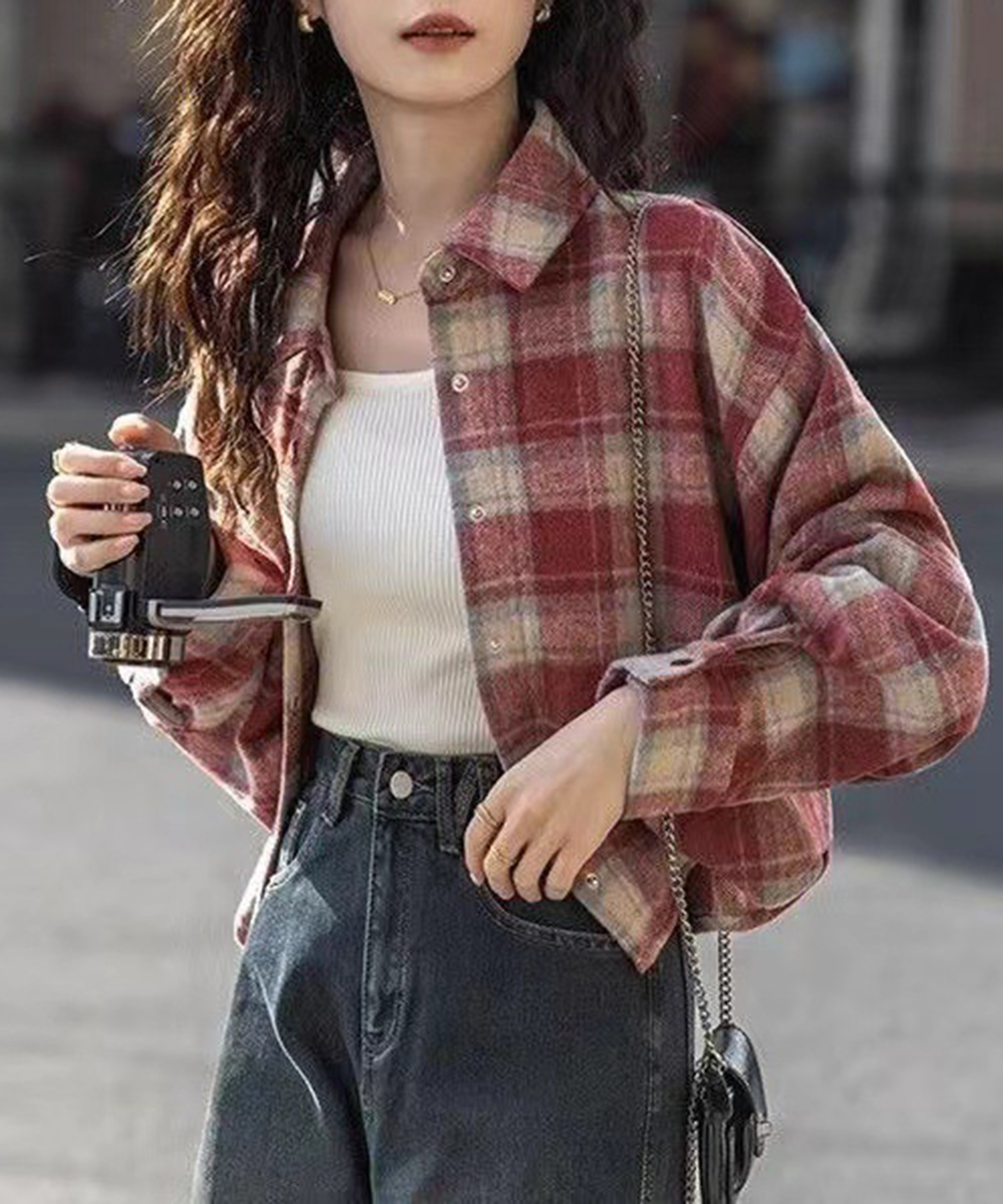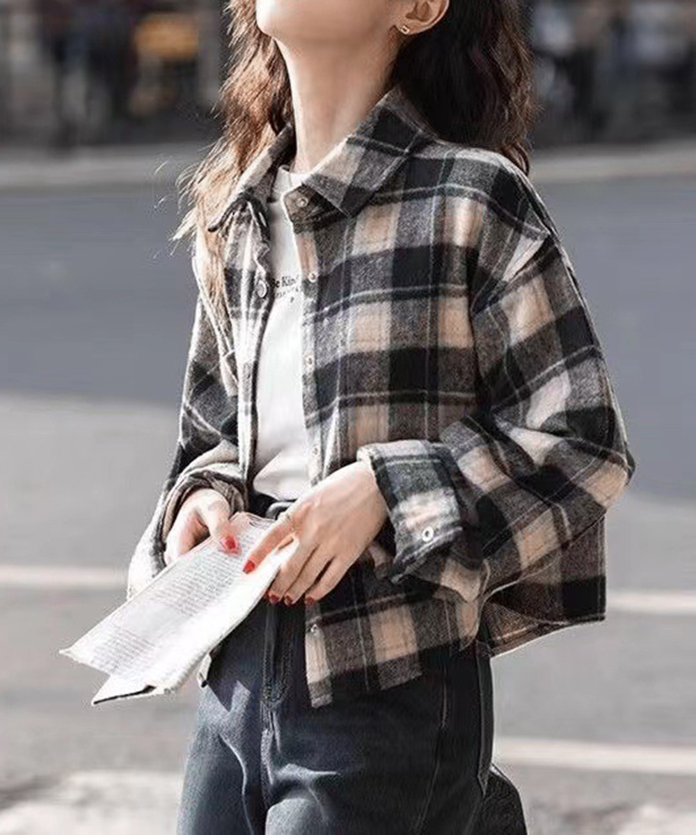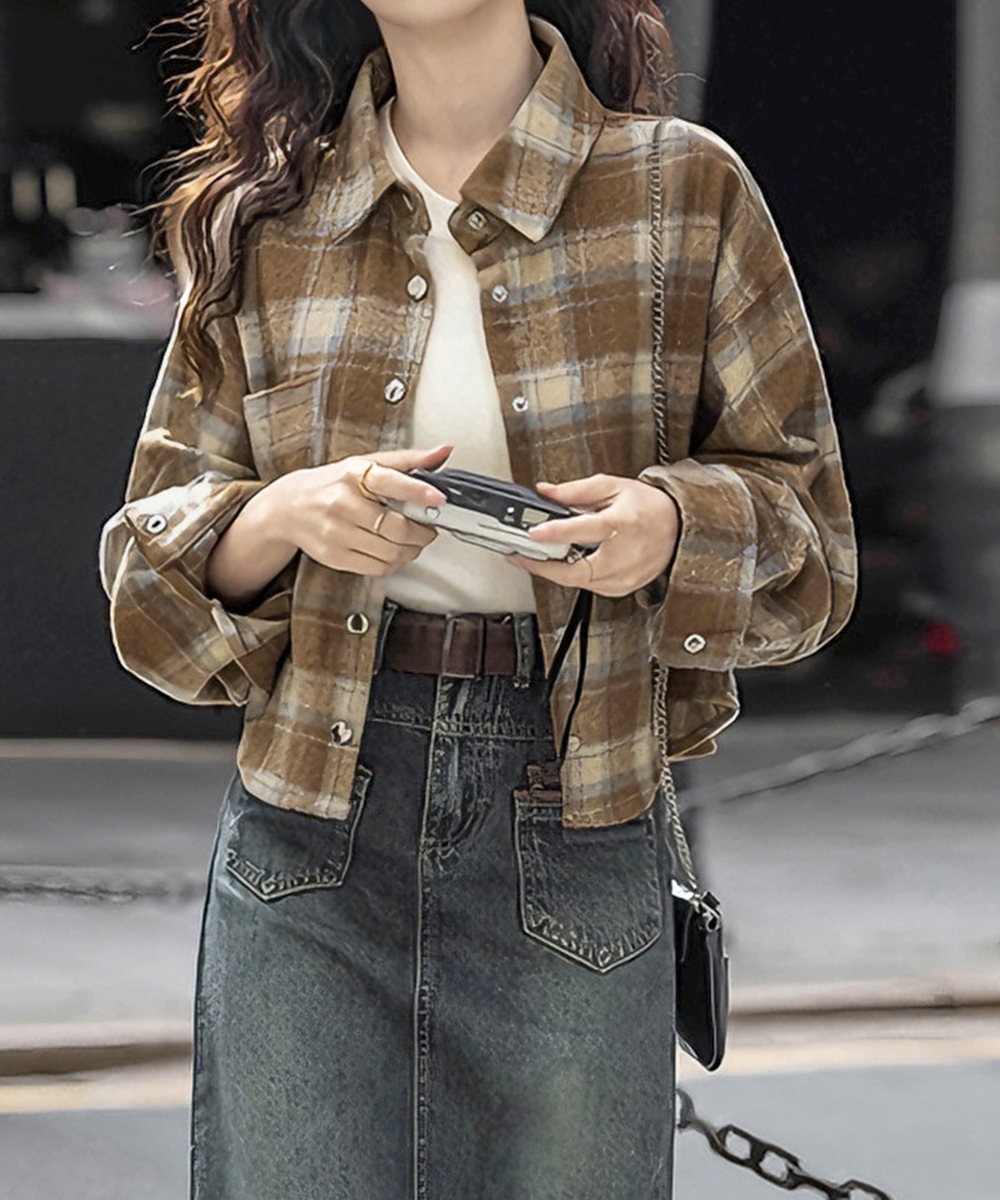 今っぽいショート丈が魅力のチェック柄レディースシャツ。