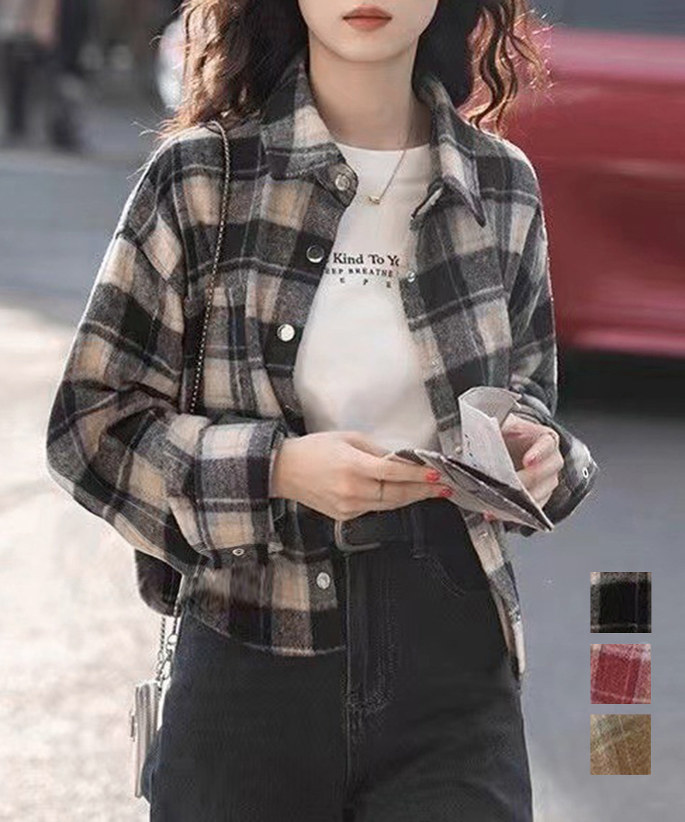 レディースライトアウター ヴィンテージライク 羽織り 体型カバー 韓国風 シャツジャケット 大人カジュアル 襟付きシャツ ドロップショルダー 着回し 短丈シャツ 春秋シャツ お洒落 ショート丈が今っぽい、チェック柄シャツトップス。 バランスの取りやすい短丈デザインで、ハイウエストボトムとの相性抜群。 デニムやスカートと合わせるだけで、こなれた大人カジュアルスタイルに。 素材:ポリエステル85%+綿15% カラー:ブラック/ワインレッド/キャメル サイズ:ワンサイズ 着丈:約49cm 肩幅:約46cm 袖丈:約48cm ゆき:約71cm 身幅:約47cm 胸囲:約94cm 裏地:なし 伸縮性:なし 透け感:なし