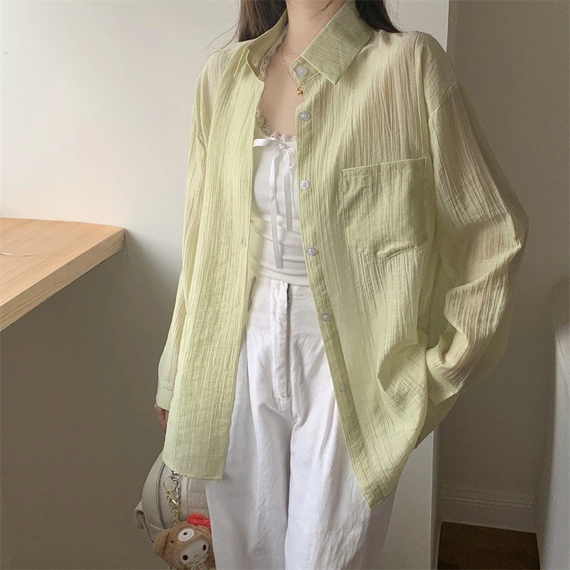 軽やかなシアー素材が魅力のレディースシャツです。 透け感のある素材で春夏のコーディネートに爽やかさをプラスします。 ゆったりとしたオーバーサイズシルエットで体型カバーも叶い、長袖デザインなので日焼け対策にも最適です。 胸元のシングルポケットがカジュアルなアクセントになっており、羽織りとしてもインナーとしても活躍する万能アイテムです。 デイリーコーデから休日スタイルまで幅広く使えます。