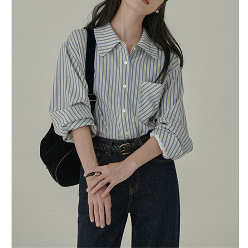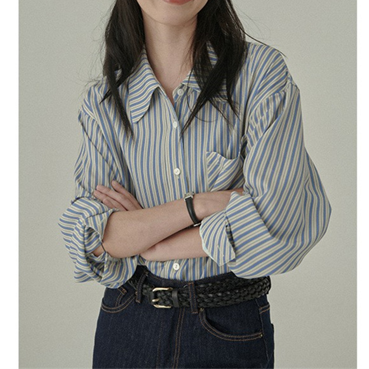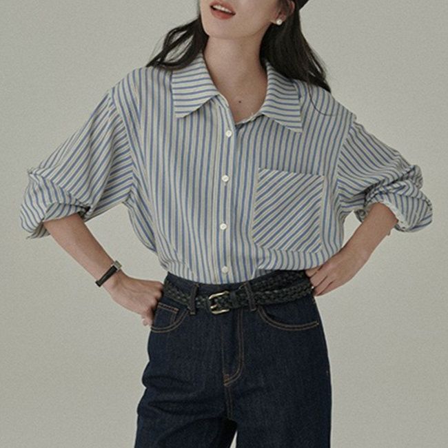 爽やかな縦縞柄が魅力的なレディースシャツです。