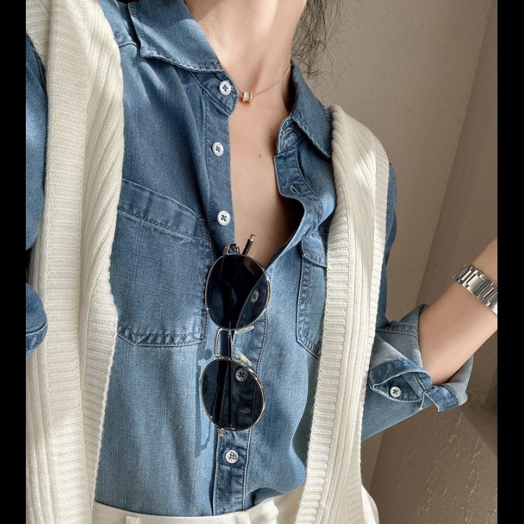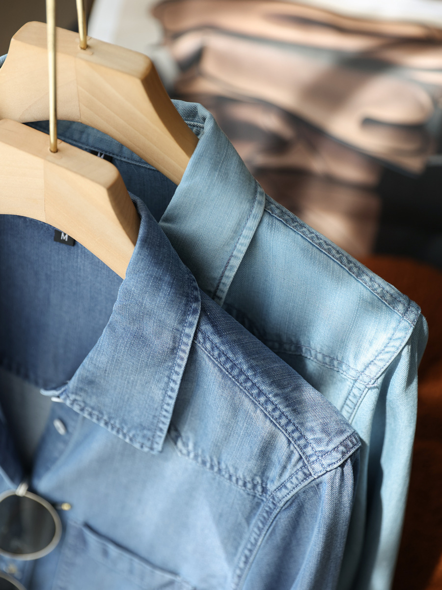 カジュアルなデニム風素材が魅力のレディースシャツです。 胸元の両サイドに配したフラップポケットがアクセントとなり、実用性とデザイン性を兼ね備えています。 長袖は袖まくりもしやすく、季節の変わり目にも活躍します。 ボタンを開けて羽織りとしても使えるため、着回し力抜群のアイテムです。 デイリーコーディネートからちょっとしたお出かけまで幅広く対応できる万能な一枚となっています。
